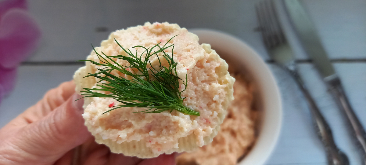 Идея этой закуски возникла спонтанно: купила небольшую баночку икры минтая. Она оказалась очень соленой (а я слишком соленое и острое не люблю), и пришлось придумать такой вариант. Яйца и сливочное масло в холодильнике есть всегда, крабовые палочки почти всегда (вот люблю я их, могу просто так съесть, хотя многие считают их очень вредными.Но, знаете, не вреднее, чем колбаса и сосиски, а я,кстати, их и не ем). Сварила два яйца вкрутую, взяла несколько крабовых палочек, икру минтая, добавила небольшой кусочек размягченного сливочного масла Все ингредиенты сложила в чашу блендера Включила среднюю скорость, и через несколько секунд вкуснейший паштет был готов Его можно намазать на хлеб, хлебец или положить в тарталетки. А если использовать только желтки, то можно смело сделать фаршированные яйца( половинки белков наполнить перебитой массой). Такую закуску не стыдно и на праздничный стол подать. Кто не боится крабовых палочек, попробуйте приготовить эту закуску. Она действительно очень