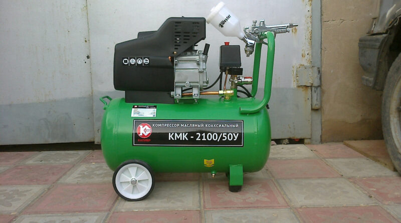 Для более-менее масштабной покраски автомобилей нужен компрессор помощнее, и среди относительно недорогих вариантов мы отыскали самый производительный – Quattro Elementi KM 50-380. В его маркировке зашифрованы показатели: 50 л – это объем воздухосборника, 380 – показатель входной производительности в л/мин. Производительность на выходе, естественно, будет ниже и составит примерно 270 л/мин. – достаточно, чтобы создать давление 8 бар за 1,5 минуты. При этом мощность двигателя (2,2 кВт) и, соответственно, энергорасходы не намного отличаются от мощности менее производительных компрессоров (1,5–2 кВт), так как КПД данной модели выше благодаря двухцилиндровой конструкции поршневой группы.