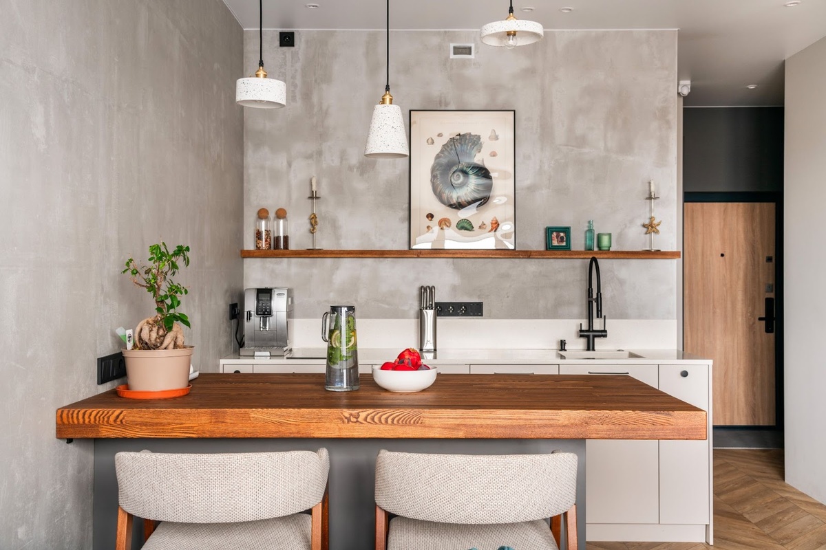 Здесь нет черновых стен — отделку намеренно оформили под бетон: нанесли обычную штукатурку «Ротбанд», затерли и покрыли лаком. Скалистый оттенок дополнили напольным покрытием в цвете дерева — укладка «елочкой» напоминает песчаную рябь. Диван Сваут от divan.ru в ярко-голубой обивке олицетворяет лазурный водоем, а декор в виде кораллов и постер с ракушкой подчеркивают морскую тематику интерьера.