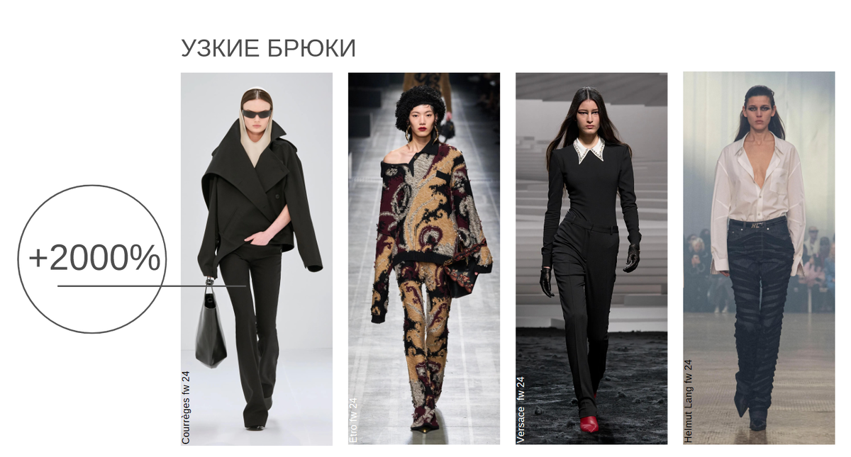 Показали мощнейший прирост — аж 2000%! Обратите внимание, что это все-таки не скинни: брючины облегают бедра, но в области икр есть немного воздуха. Сразу хочется сказать девочкам, которые проходили типирование по моей авторской системе: обратите внимание на силуэт. Если вы относитесь к типажам, которым подходит устойчивость, не забудьте докупить к брюкам массивную обувь. Или выбирайте более широкие модели — они все еще остаются с нами))