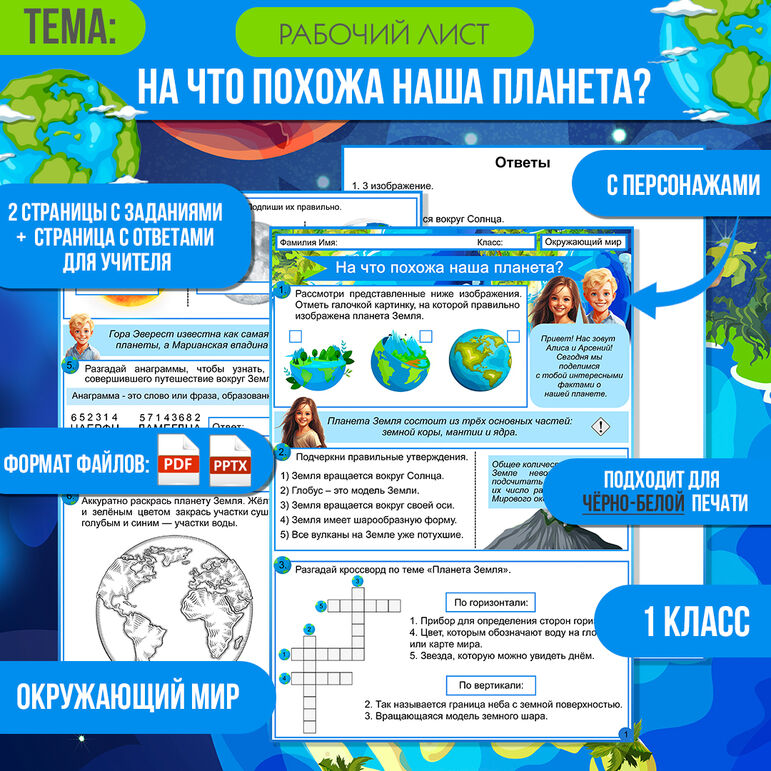 Уникальность данного рабочего листа заключается в присутствии персонажей – учеников 1 класса Алисы и Арсения, которые поделятся с ребятами интересными фактами о нашей планете.