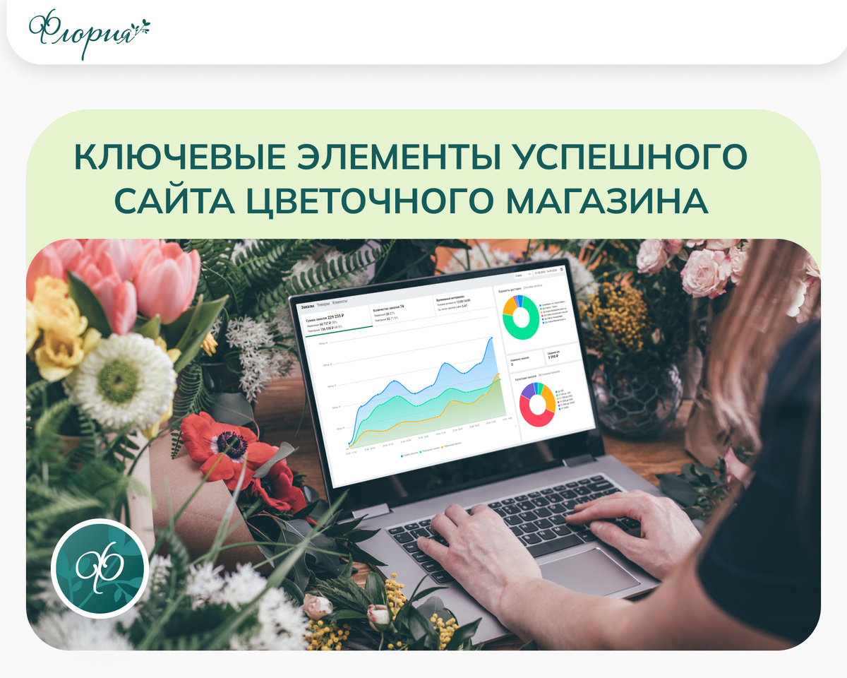 Представьте, что вы не владелец цветочного магазина, а клиент, и вам нужно выбрать цветы на сайте. Что вас привлекает? Какие функции сайта помогают сделать выбор? Флория ответила на эти вопросы, чтобы вывести ваш сайт на новый уровень и улучшить опыт клиентского пользования. Существует три кита, на которых держится сайт цветочного магазина: он должен быть визуально приятным, выполнять свои функции и быть удобным в использовании. Про визуальный язык. Цветовая гамма на сайте вашего магазина несёт свой смысл. Она способна как привлекать клиентов, так и отталкивать. Выбирайте пастельные и природные оттенки, чтобы закрепить ассоциацию с растениями и приятными эмоциями. Если ваш магазин имеет фирменные цвета, то дизайн сайта с их использованием отложится в памяти покупателей. Карточка товара – та самая часть визуала, которая “продаёт”. Она подробно рассказывает о товаре, помогая в выборе. Поэтому важно оформить её по всем правилам с целью привлечения внимания клиента. О том, как правильно со