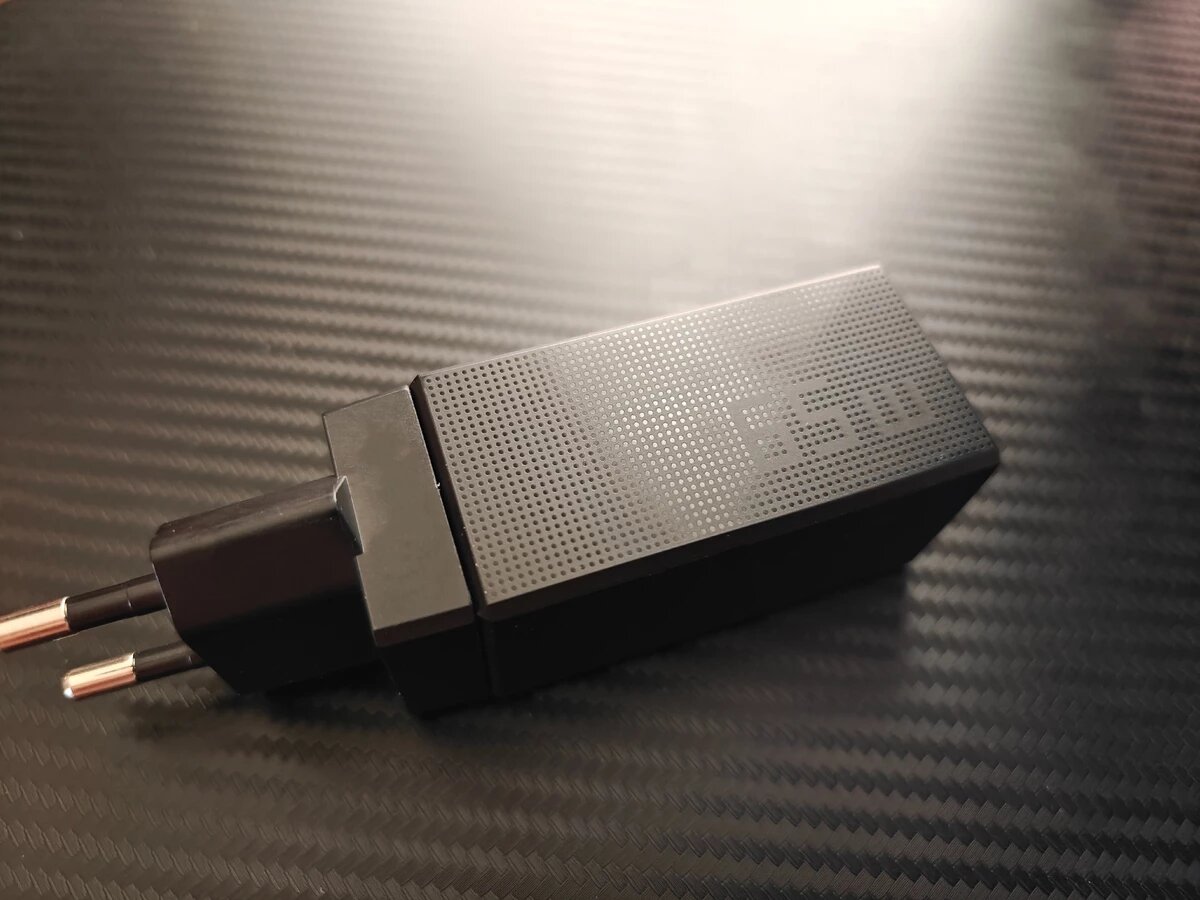Ноутбук поставляется в небольшой картонной коробке, внутри которой располагается еще пара коробок. Одна из них содержит в себе ноутбук и документацию, а во второй расположился малюсенький 65-ваттный блок питания, кабель USB Type-C на Type-C и переходник с USB Type-A на RJ45.