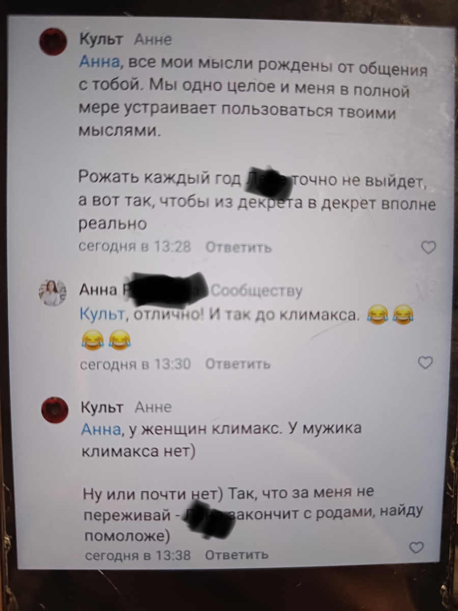 Продолжаю доставать из своего старого телефона жуткие переписки с нарциссом. Это был уже конец, утилизация и он не стеснялся рассказывать о своих планах. Контекст здесь такой - Культ - это нарцисс, Анна - это я. Переписка идет с фейковых аккаунтов - поскольку на этой стадии, после жутких кошмаров, что он мне в мессенджеры писал - я его везде заблокировала. Остался вот этот последний канал связи, который он создал, чтобы не палиться и не попасть под статью, либо в ПНД. И я потихоньку там пыталась позакрывать гештальты, чтобы понять - что это вообще такое было. Напомню причину нашего конца - он сообщил мне, что от него беременна другая. Кратко и очень художественно эту историю я изложила здесь в песне: Конечно, сам факт того, что он решил связать с этой женщиной жизнь, дети это навсегда, меня крайне удивил и шокировал, т.к. это дама совсем не нашего круга и мне очень во многом уступала, по сути - полная противоположность тому, как мог бы выглядеть нормальный союз нашего уровня. Но,