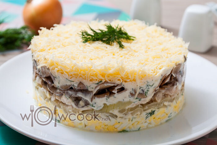Здравствуйте, дорогие друзья! Открываю сборник новогодних блюд. Начинаю с салатов. Представляю новогодний слоеный салат, его фото на заставке. Праздничный салат с грибами, он готовится с обжаренными шампиньонами. Ингредиенты: Лук нарезаем полукольцами и обжариваем в небольшом количестве масла до полуготовности, чтоб он остался хрустящим. Пока ничего не солим и не перчим. Обжариваем промытые и нарезанные слайсами шампиньоны, затем отдельно нарезанное на кусочки куриное филе. Натираем на мелкой терке отваренные в крутую яйца и твердый сыр. Готовим заправку из греческого йогурта, горчицы, чеснока и свежей зелени. Ставим на большое плоское блюдо кондитерское кольцо, смазываем его внутри растительным маслом и выкладываем все подготовленные ингредиенты: вареные яйца, соус, хрустящий лук, солим и перчим, соус, куриное филе, чуть-чуть солим и перчим, соус, жареные шампиньоны, соус, сыр. Заворачиваем пищевой пленкой и убираем на блюде в холодильник часа на 2. Перед подачей снимаем ко