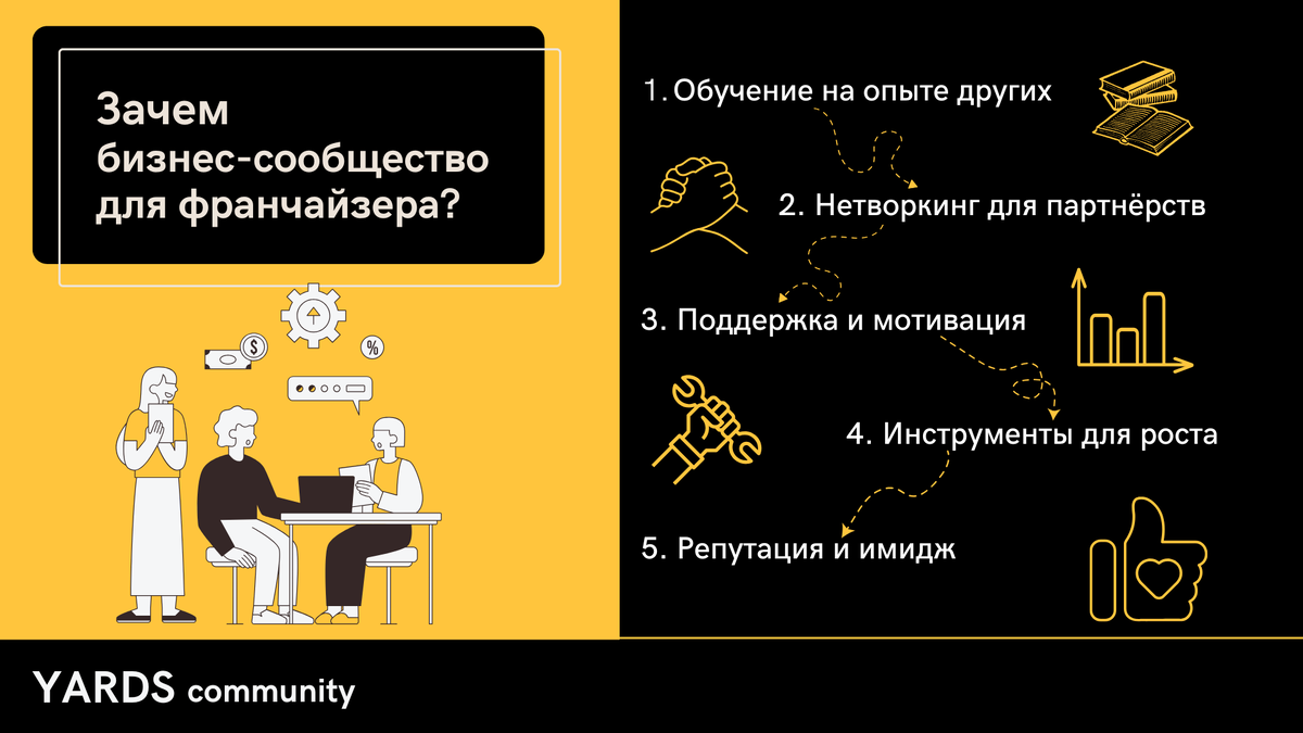 YARDS community — это бизнес-сообщество по франчайзингу, Наша цель – создать экосистему, где каждый может найти свой путь к успеху и самореализации. Мы стремимся к тому, чтобы каждый участник сообщества ощутил силу и возможности, которые открывает ЯРДС. Но давайте разберемся, для чего в целом нужны бизнес-клубы.
