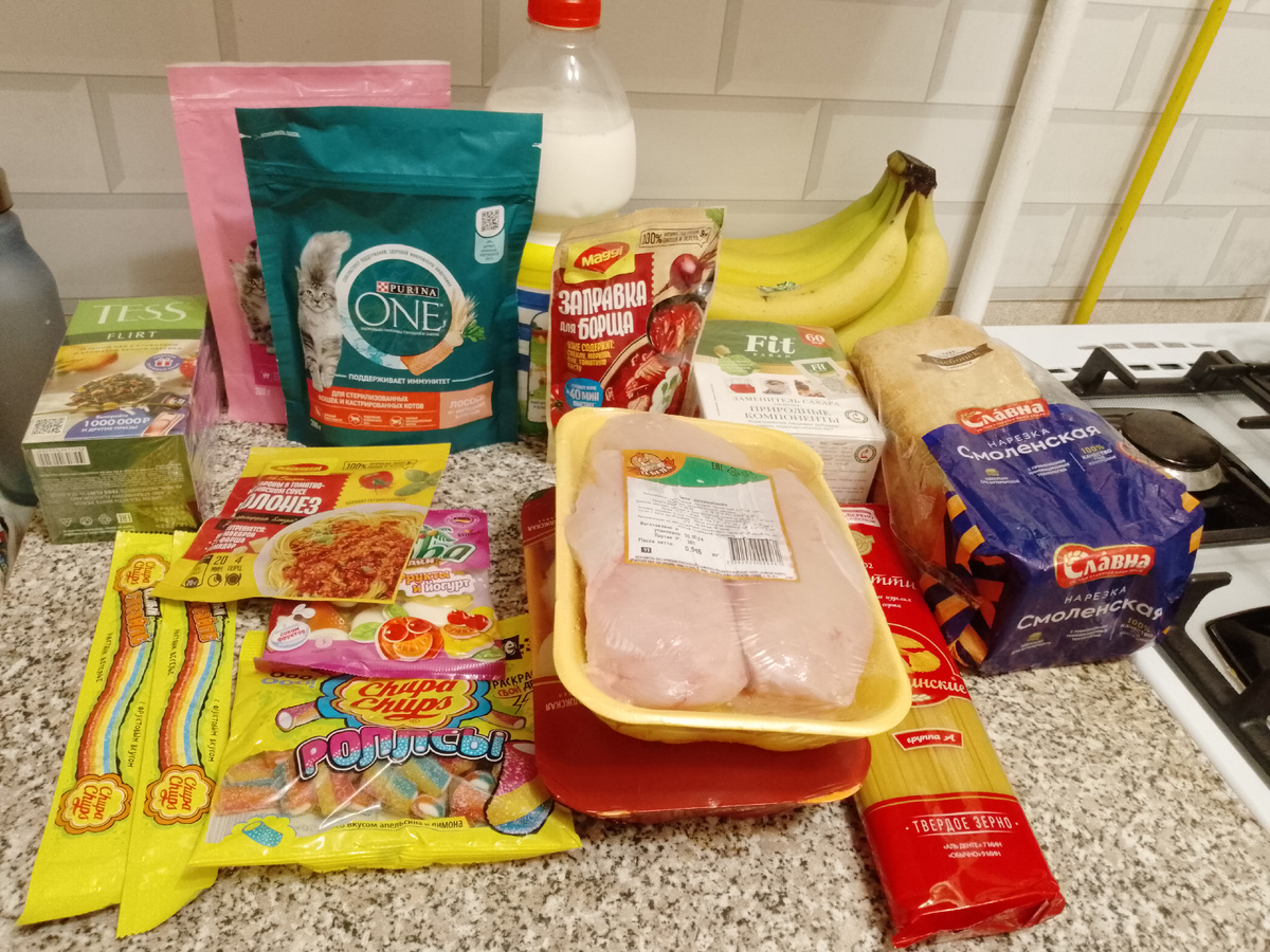 Всем привет. Я продолжаю решать свой вопрос, сегодня должно все решиться, хотя бы основная часть вопроса. Как разберусь обязательно напишу об этом. И так моя продуктовая закупка на эту неделю. Кстати эта закупка мне обошлась почти в 1900 руб. Так же позже пришлось бежать ещё в магазин за колбасой и сыром, т. к. написал тренер сына, у них снова игра. Надо бутерброды сделать же в дорогу. У меня сейчас с беготней опять нет времени нормально готовить, да и поесть тоже. На завтрак был чай с яблочным пирогом. Хотела сделать смузи с гранолой, но вспомнила, что блендер брала племянница, и не вернула. На обед и ужин приготовила макароны с подливкой. Также на перекус были фрукты(бананы) и батончики злаковые с чаем.
