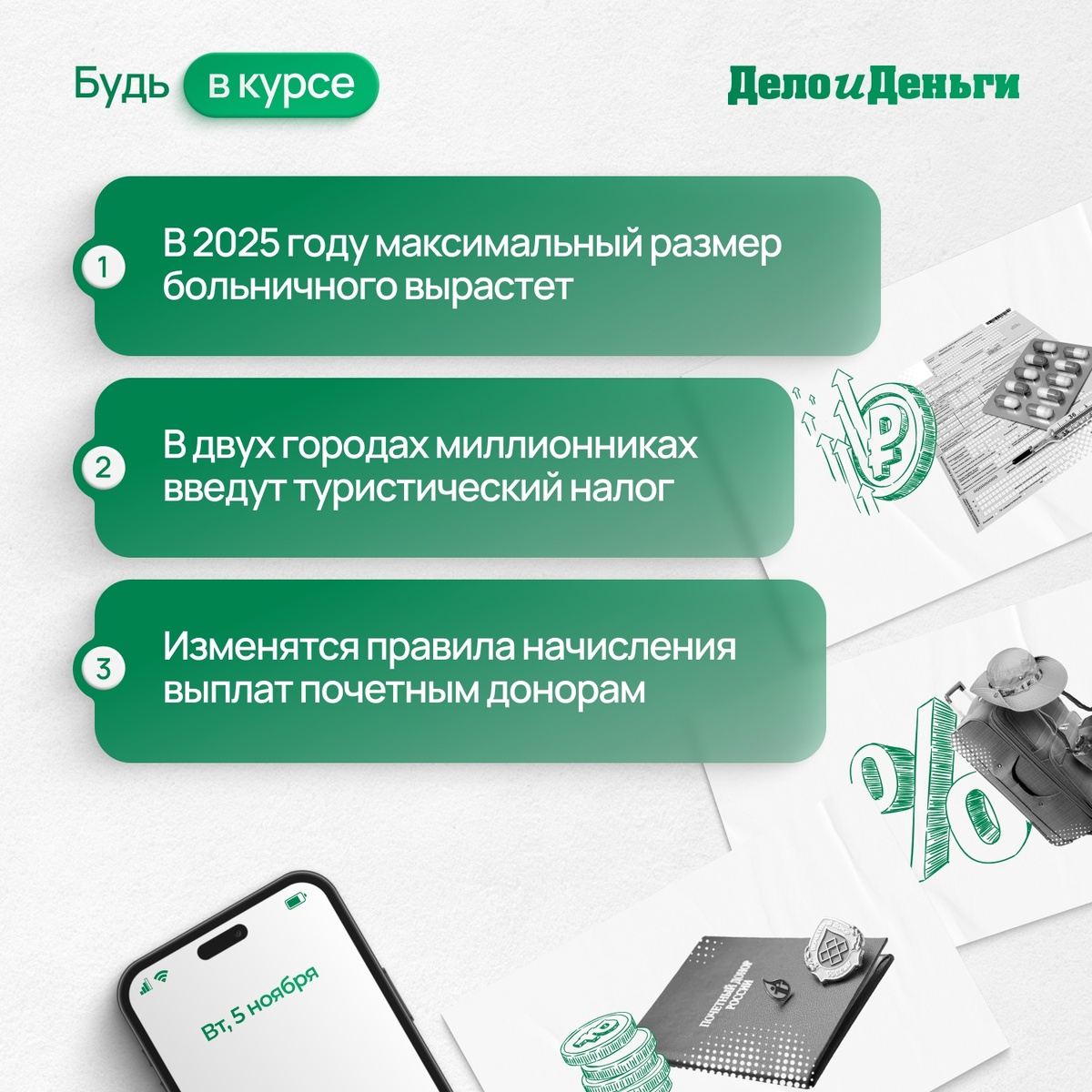 Максимальный размер выплаты по больничному в 2025 году составит 5,7 тыс. ₽ в день, в 2026 году – 6,8 тыс. ₽. Ежегодно увеличение происходит в зависимости от роста средней зарплаты. Максимальная сумма положена работникам с доходом более 200 тыс. ₽ в месяц и стажем от восьми лет. Они получают 100% среднего заработка за два года, но не более максимального лимита. С 2025 года в Казани и Сочи будет взиматься туристический налог в размере 1% от стоимости проживания, но не менее 100 ₽ в день. Он будет включен в стоимость номера и указан отдельной строкой в платежных документах. Налог не будет взиматься с льготных категорий граждан. В Казани также планируют освободить от налога туристов моложе 18 лет, а в Сочи – жителей с постоянной регистрации. С 30 ноября гражданам, награжденным знаком «Почетный донор России», ежегодная выплата будет назначаться автоматически. Если вы получили этот статус до 30 ноября, вам необходимо предоставить реквизиты банковского счета для получения мер социальной под