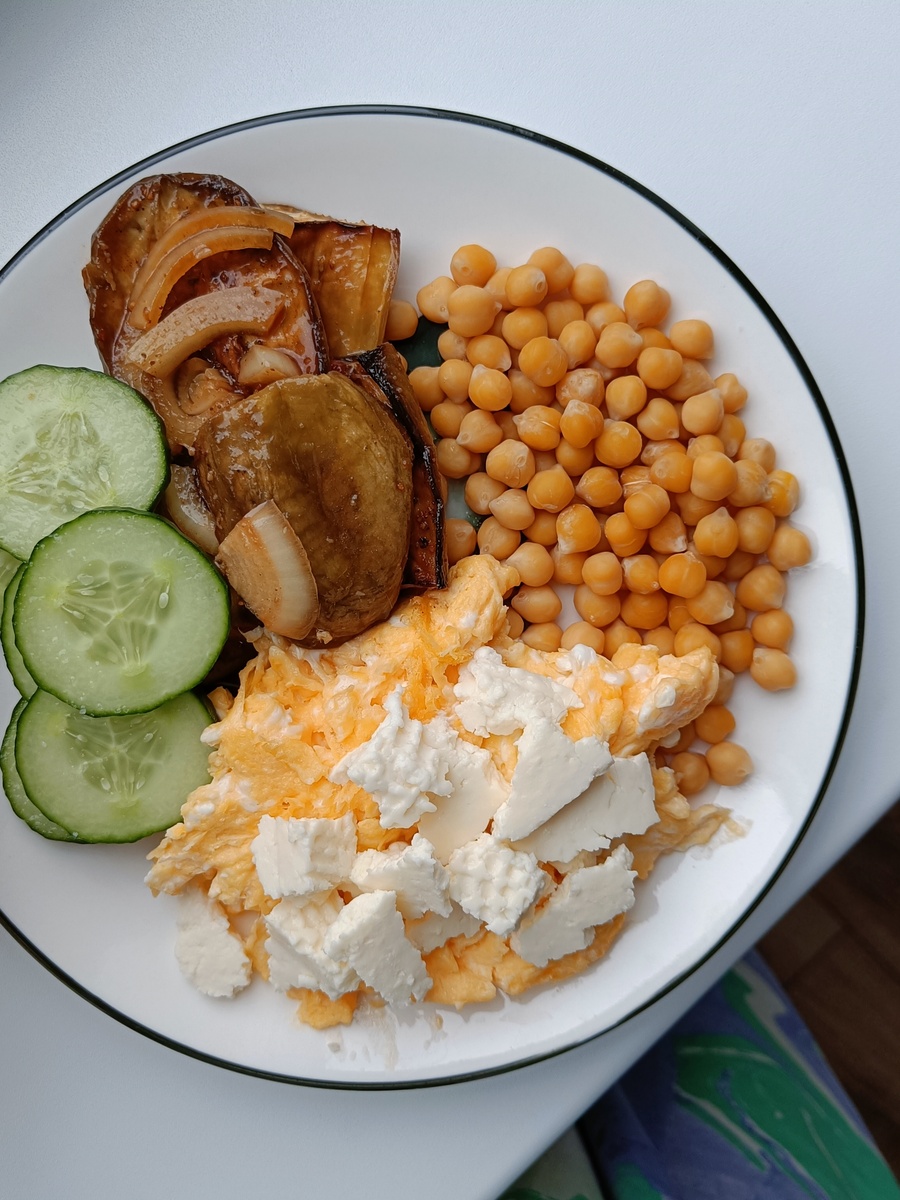 - Скрэмбл + нут + кавказский сыр + маринованные баклажаны и лук + огурец
