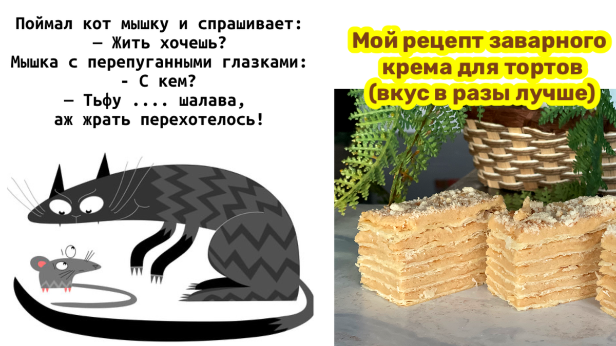 Женщина в узкой юбке не может подняться на ступеньку автобуса и судорожно ищет сзади руками, чтобы расстегнуть молнию снизу юбки. Вдруг сильные мужские руки подсаживают ее за талию на ступеньку, она оборачивается и говорит: «Мужчина, что вы себе позволяете!?», а он ей в ответ: «После того, как вы два раза расстегнули и застегнули мне ширинку, я думал, что мы больше чем друзья!» /анекдот для хорошего настроения/ Чаще всего заварной крем делаю именно таким способом и с таким составом ингредиентов. Крем получается с другим, неклассическим вкусом, но «Наполеон» именно этим кремом получается просто шедевральный! Даже если вы купите готовые коржи для торта в магазине, вам никто не поверит, что торт у вас наполовину домашний. Кстати, с таким кремом можно делать торт из печений, или с тонким армянским лавашом, или быстрый вариант домашнего торта - из сливочной крошки. 🔥А чтобы приготовление еды не было скучным, в конце публикации и в закреплённом комментарии ⤵️⤵️⤵️ вас ждут весёлые карт