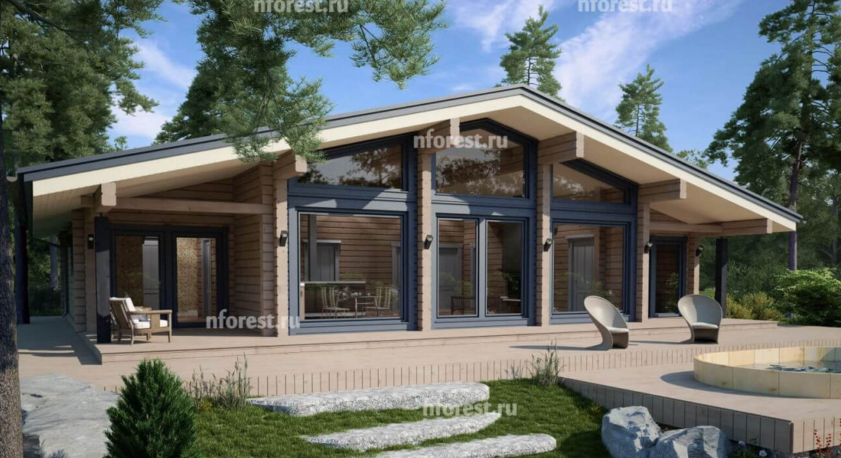 Архитектурное решение предусматривает высокие потолки и просторные жилые зоны, что делает одноэтажный дом удобным для всех членов семьи.