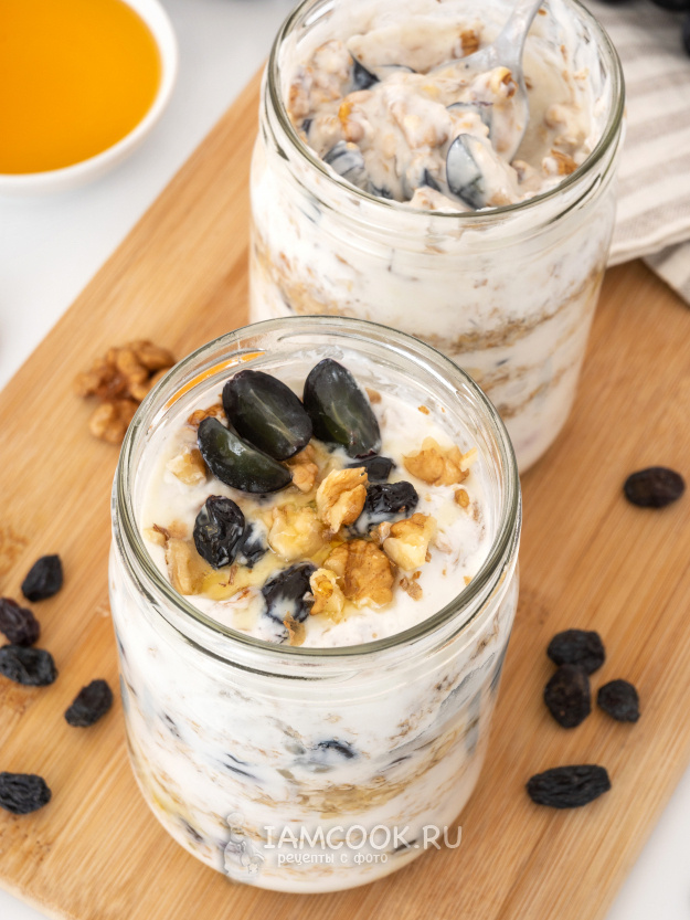 Думаете, я преувеличиваю? Сейчас сами убедитесь. Этот рецепт создан для тех, кто ценит каждую минуту утром, но не готов жертвовать качеством завтрака. Никакой варки, никакой суеты – только ваше желание и холодильник. 📖 Что нам понадобится? ⚖️ Получается две полных банки объёмом 0,5 л 👩🍳 Как готовить? 1. Начнём с подготовки. Достаньте две чистые баночки по 0,5 л. Можно использовать красивые стеклянные – завтрак будет радовать глаз. 2. Изюм у нас будет особенным: залейте его кипятком на 2-3 минутки. Это не только очистит его, но и сделает мягче и сочнее. Потом просто промойте и промокните бумажным полотенцем или положите изюм в дуршлаг и подождите, пока стечёт вода. 3. Теперь самое интересное – собираем наш завтрак слоями. Представьте, что делаете слоёный торт, только намного проще: Первый слой: кефир (60 г). Второй: овсяные хлопья (15-20 г) – они впитают всю пользу кефира. Третий: мёд (1 ч.л.) – для естественной сладости. Четвёртый: наш подготовленный изюм (15-20 г) Пятый: снова кеф