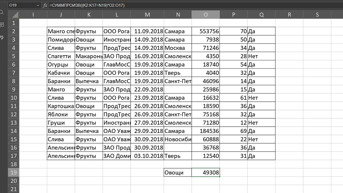 Сопоставлять данные и производить с ними операции в таблицах можно разными способами. Раньше мы чаще описывали, как это сделать с помощью поисковых функций. Сегодня решим экономические задачи с помощью функции, которая официально относится к семейству математических. В некоторых случаях она неплохо заменяет работу с массивами, избавляя от необходимости вводить данные с помощью Ctrl+Shift+Enter. Функция СУММПРОИЗВ – один из тех случаев, которые лучше сперва объяснить на примере. И вы сразу назовете еще множество вариантов применения. А уже потом дадим описание, если оно вам еще будет нужно. Возьмем нашу тестовую таблицу с данными по продажам овощей-фруктов в разных городах. Соберем в одну ячейку сумму всех трат на овощи. В этом нам поможет формула следующего вида: =СУММПРОИЗВ((K2:K17=N19)*O2:O17). С ее помощью мы взяли из столбца К все строки, соответствующие условию «овощи», перемножили содержимое ячеек М и О, а потом сложили. Но по факту из-за того, что в М – нечисловое значение, мы п