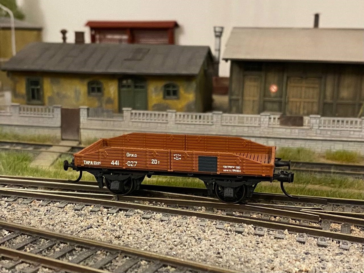 Модель платформы для перевозки марганца, изготовленная из набора для самостоятельной сборки производства московской студии "МакетНО" в масштабе 1:87. Модель уже известна постоянным читателям канала - весной был публикован обзор моделей платформ от студии "МакетНО". В обзоре было упомянуто, что ранее платформы такого типа производились фирмой "Ремодель", и были одними из самых известных моделей в отечественном ЖД моделизме конца 90-х - начала 2000-х годов. Данная модель от "Макетно" была собрана (а точнее зачищена и покрашена, так как вся модель состоит из одной детали, напечатанной на 3D принтере) с небольшими доработками. В частности вместо штатно предусмотренных колесных пар диаметром 12,6 мм на этой модели, как и на другой модели от Макетно, о которой было рассказано недавно, были установлены колесные пары диаметром 11,5 мм. Это потребовало установки в буксы латунных подшипников, которые после небольшой рассверловки встали на место и обеспечили прекрасные ходовые характеристики мод