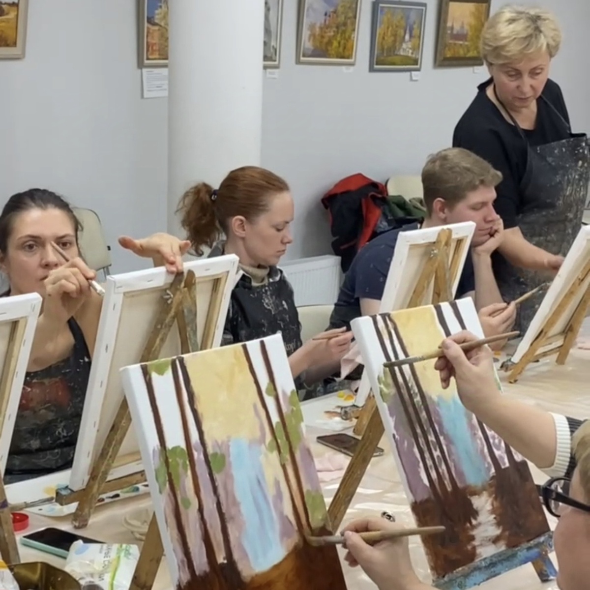 Какие бывают мастер классы по живописи маслом? 2 варианта. Первый, когда все вместе, дружно пишем одну картину. Обычно Я предлагаю холст 30/40. Это самый комфортный размер для начинающих художников. За три часа каждый справляется, и не сильно устаёт. Я стою во главе этого прекрасного сборища и надиктовываю, что надо делать, какие краски брать, как смешивать и куда и как класть. Подхожу к каждому, комментирую, показываю персонально, если не понятно с первого общего объяснения. В конце занятия, по просьбе, могу помочь доделать. Закончить картину, самое сложное. Один правильный мазок может всё исправить. Второй вариант, когда все пишут собственную картину. Тут и холсты обычно побольше. И передо мной задача посложнее. Мне надо понять каждого, что он задумал, и найти способ воплотить его задумку. Хорошо, если художник уже знаком с масляной техникой. Тогда мне будет полегче. А если это дебют - придется очень постараться. Работаю персонально с каждым. Результат один и тот же : картина масло
