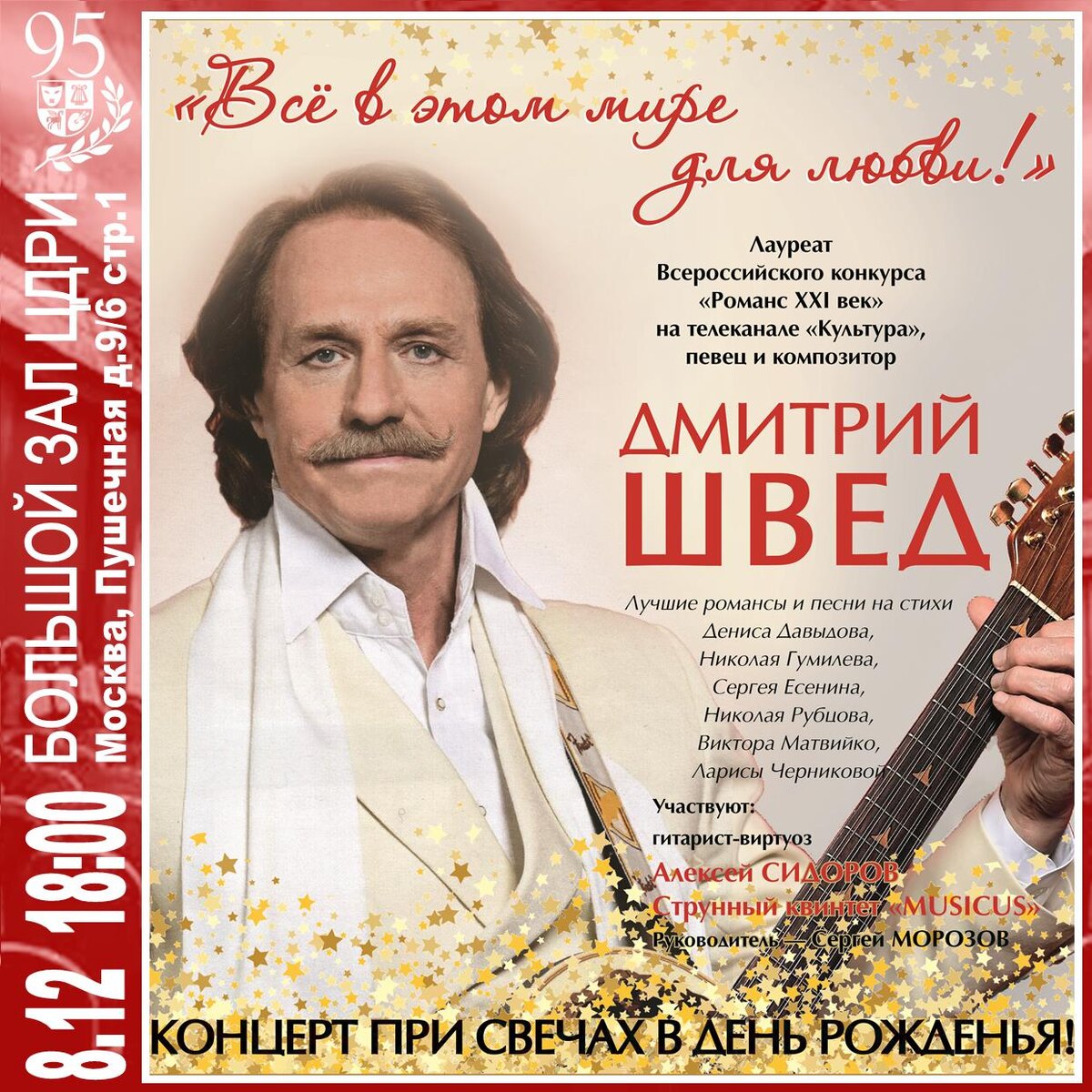 Дмитрий Швед — Концерт в День рожденья! «Всё в этом мире для любви!» Лауреат Всероссийского конкурса «Романс XXI век» на телеканале «Культура», певец и композитор Дмитрий ШВЕД Лучшие романсы и песни на стихи Дениса Давыдова, Николая Гумилева, Сергея Есенина, Николая Рубцова, Виктора Матвийко, Ларисы Черниковой. Участвуют: Гитарист-виртуоз Алексей СИДОРОВ Струнный квинтет «MUSICUS»