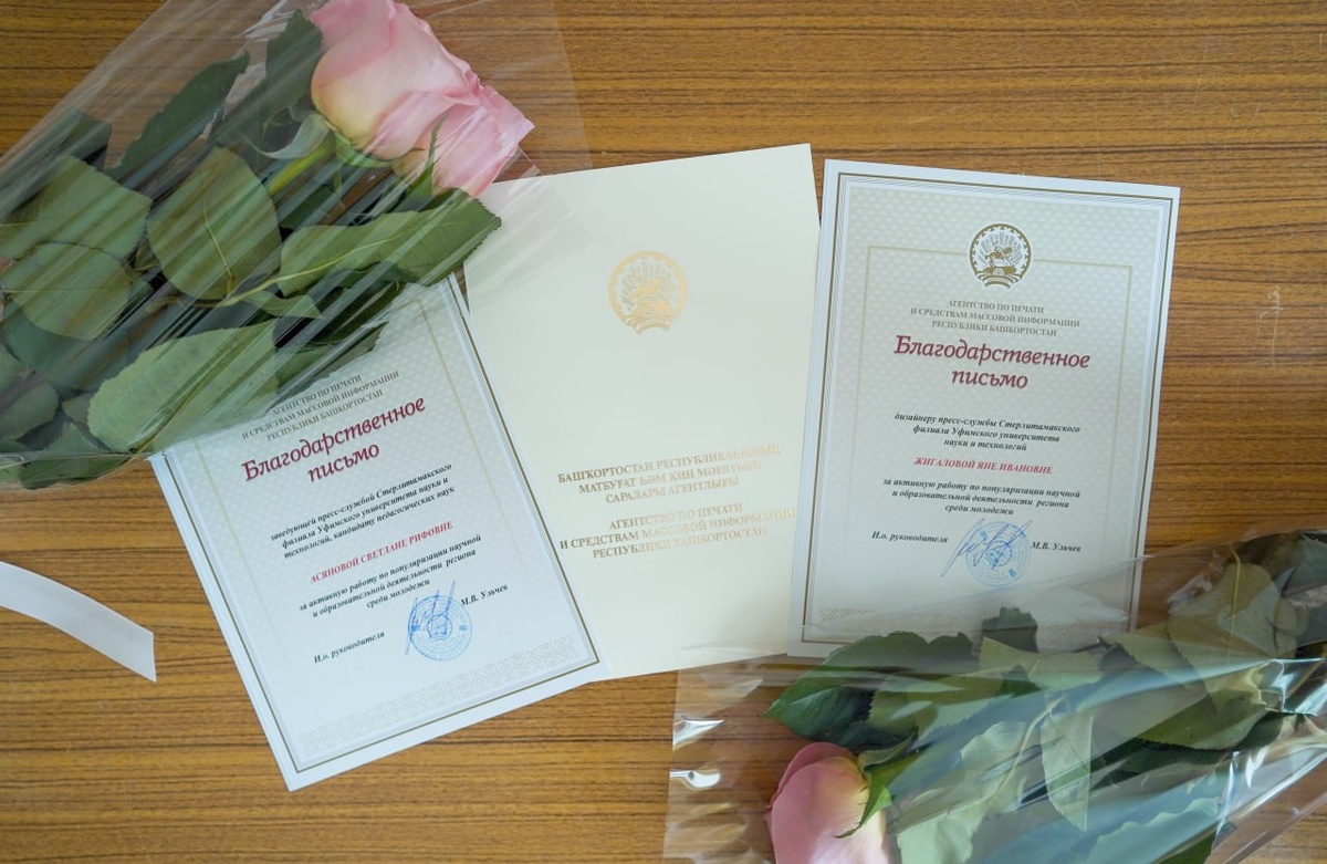 В рамках поддержки и развития медийной деятельности в сфере высшего образования, Агентство по печати и средствам массовой информации Республики Башкортостан отметило благодарственными письмами представителям ведущих вузов региона. Награды за активную работу по популяризации научной и образовательной деятельности среди молодёжи получили также сотрудники пресс-службы Стерлитамакского филиала Уфимского университета науки и технологий — заведующий пресс-службой СФ УУНиТ, полковник полиции в запасе, кандидат педагогических наук Светлана Асянова и дизайнер пресс-службы Яна Жигалова от и.о. руководителя Агентства по печати и СМИ Республики Башкортостан Максима Ульчева. В торжественной обстановке на заседании Ученого совета директор СФ УУНиТ, доктор филологических наук, профессор Игорь Сыров отметил работу пресс-службы филиала, направленную на создание положительного образа университета и активное вовлечение студентов в научную жизнь. Важность информационной политики заключается не только в ра
