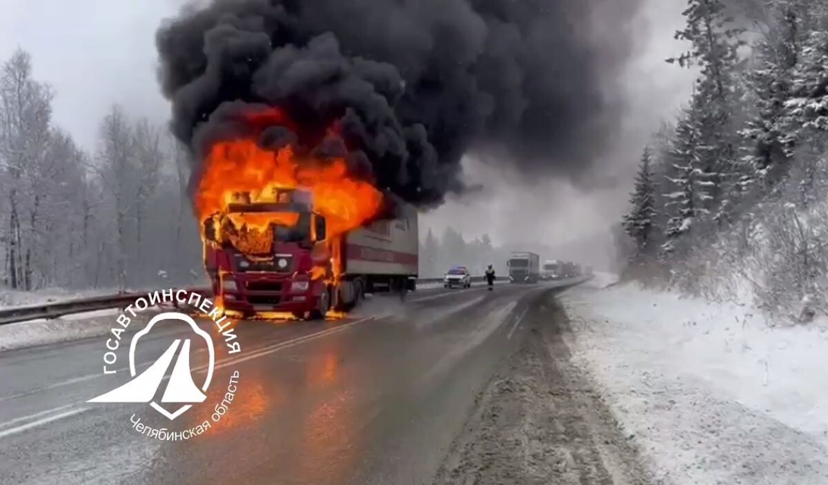 Видео о том, как большегруз одной из федеральных торговых сетей полыхает посреди дороги, поделились в пресс-службе ГАИ Челябинской области. «1737-й километр трассы Москва-Челябинск, в сторону города Москвы. Загорелось грузовое транспортное средство марки MAN Предварительно – возгорание моторного отсека», – сообщил за кадром представитель ведомства. В районе места аварии организовано реверсивное движение, но водителей предупредили, что могут и временно приостановить проезд по указанному участку. Как сообщал «ЧелябинскСегодня» ранее, вчера в Челябинской области произошла авария с двумя погибшими. На дороге в Чебаркульском районе столкнулись ВАЗ и Renault. Водитель и пассажир отечественного автомобиля скончались на месте ДТП. Водителям напомнили про то, что нужно быть особо осторожными при поездках в условиях непогоды, чтобы не стать жертвой ДТП по своей или чужой вине.