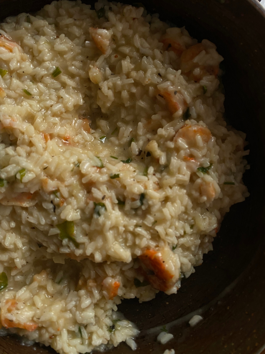 На наше вкусное Ризотто нам понадобится: - Рис арборио или спец. для ризотто, но я брала сорт басмати, мне понравилось и дешевле вышло) - Креветки 150-200 гр. - Немного слив. масла для обжарки креветок - Растительное масло (в идеале оливковое для жарки) - Бульон 400-500 мл. (если вы отваривали перед этим креветки, возьмите его, так же подойдет обычный куриный или просто воду фильтрованную) - Лук репчатый, небольшая головка - Чеснок 1-2 зубчика - Зелень свежая (петрушка, лук) и ароматные травы сушеные (у меня были тимьян и базилик) Начинаем готовить 🤌🏻 1. Чистим креветки, половину режем помельче, половину оставим целыми. 2. На сковороде топим сливочное масло, туда добавляем чеснок (предварительно ножом его придавите) и наши ароматные травы и всыпаем креветки туда. Жарим от силы 3-5 минут, помешивая, что бы они у нас просто подрумянились. 3. Убираем креветки в отдельную посуду и убираем от туда чеснок. 4. В эту же сковороду мы наливаем наше растительное масло, добавляе