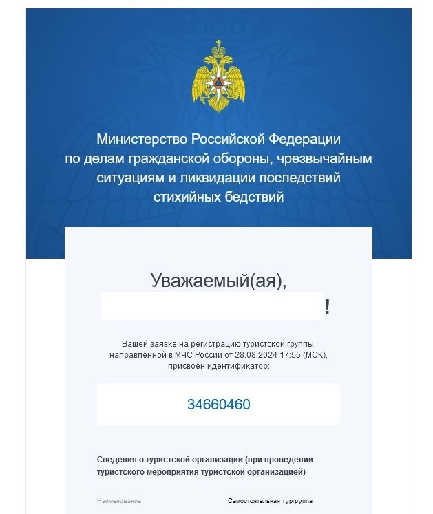Ещё заранее я регистрировала нашу группу в МЧС. Это был какой-то отдельный извращенный квест, потому что на сайте МЧС я нашла бланк регистрации тургрупп, скачала его, заполнила на нас всех, даже заставила девчонок распечатать и подписать и отправить мне, печатала у себя и подписывала финально. Ну, думаю, куда грузить?...В общем, в итоге я заполнила все онлайн, без всяких подписей. Сначала я думала что регистрируюсь в отделе МЧС по Хакасии, а потом Таня напомнила мне, что Ергаки - это уже юг Красноярского края и я промахнулась. Что ж, пришлось корректироваться. В общем, тут есть порядок регистрации тургрупп и номера телефонов, по которым потом надо будет сообщить о том что вы вернулись. Регистрировать тургруппу необходимо не позднее, чем за 10 рабочих дней до выхода. Я примерно успела и мне на почту пришло вот такое уведомление.