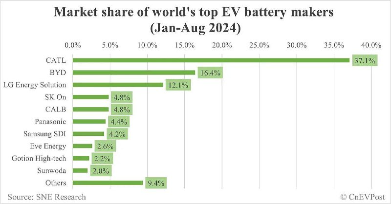 В январе-августе CATL и BYD оставались двумя крупнейшими в мире производителями аккумуляторов.