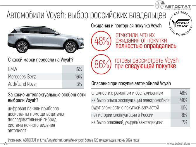 По данным аналитического агентства «АВТОСТАТ», 48% водителей, пересевших на Voyah с других авто, положительно оценивают её эксплуатацию. А 86% готовы рассматривать эту марку при следующей покупке машины. Онлайн-опрос среди владельцев Voyah показал, что 16% из них до этого ездили на BMW, столько же на Mercedes-Benz, а 8% — на Audi или Land Rover.