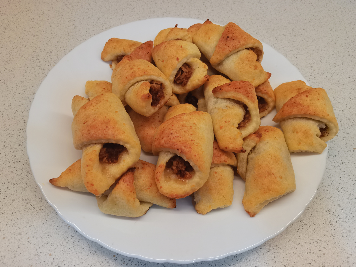(16штук) Масло сливочное 90гр Мука 160гр Разрыхлитель 1ч.л. Сахар 40гр (2ст.л.без горки) Творог 200гр Начинка: или (100гр) кураги или чернослива или 1большое яблоко +корица . Муку и разрыхлитель соединить с маслом до образования крошки. Добавить творога и сахара. Тесто необходимо отправить в холодильник на 45 мин. . Начинка на выбор. Из кураги или чернослива: 100гр кураги или чернослива залить на 5 мин 200мл кипятка. Измельчить блендером. . Из яблока Натереть на тёрке 1 большое яблоко, добавить 2 ч.л. корицы, 4 ч.л.сахара. Перемешать. Разделить тесто на 2 части. Сначала 1 часть раскатать, разрезать на 8 частей, положить начинку, свернуть в рогалики. Выпекать 20 мин при температуре 180 градусов. Затем повторить все тоже самое со второй частью.