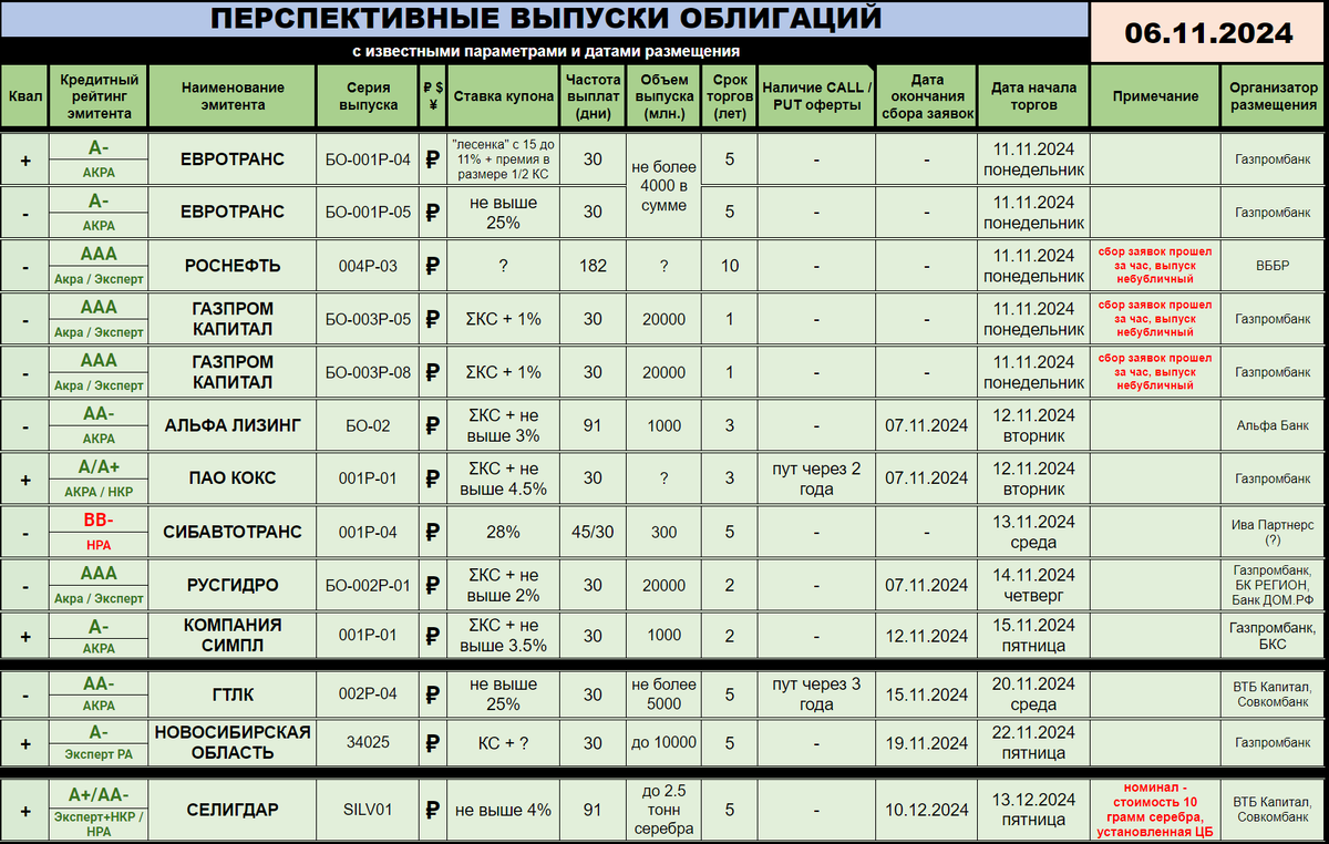 🙃 Добрый вечер, друзья! Долговой рынок капельку ожил, что приятно - еще пара недель такой динамики и портфели зеленым цветом нальются :) А лучше бы и вовсе сломать тренд, но пока на это я бы не рассчитывал. Ожил и новостной фон, ловите свеженькое! ---------- 🆕 НОВЫЕ РАЗМЕЩЕНИЯ / АНОНСЫ: 🍁 Сразу на три выпуска сегодня прошел сбор заявок без предварительного уведомления, а значит стаканы нам ответят звенящей тишиной, вероятнее всего. Тем не менее, упомяну: РОСНЕФТЬ собирала денежки в выпуск 004Р-03 - десятилетние бумаги с полугодовыми купонами, ставка которых не раскрыта пока что, да и не так важно. А вот ГАЗПРОМ КАПИТАЛ собрал заявки сразу на два выпуска длинной в год: БО-003Р-05 и БО-003Р-08 общим объемом не менее 40 миллиардов рублей. Здесь уже известно про ежемесячные плавающие купоны с привязкой к КС и премией в 1%, что непозволительно мало! Старт у всех трех бумаг 11 ноября, в понедельник, но я бы не рассчитывал на улов :) 🍁 СЕЛИГДАР (🅰️➕🅰️🅰️➖) завязал с золотом и перек