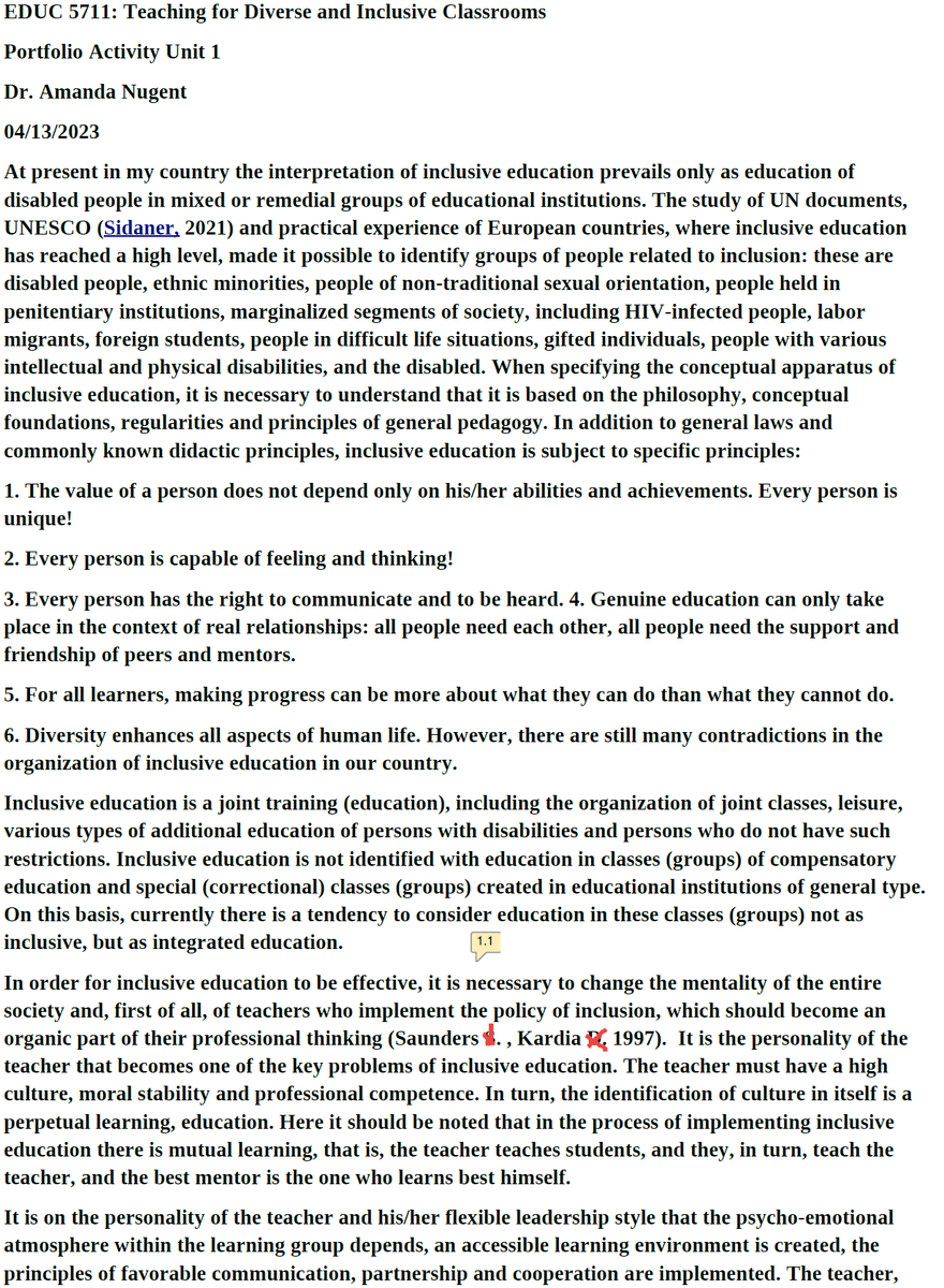 EDUC 5711: Teaching for Diverse and Inclusive Classrooms Portfolio Activity Unit 1