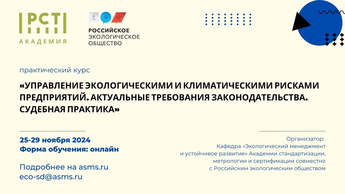 Уникальность программы заключается в сочетании актуальных законодательных изменений, реальных кейсов судебной практики и современных методик анализа климатических рисков, что позволяет не только понимать правовые требования, но и выстраивать эффективные стратегии адаптации. В рамках курса участники изучат: На курсе будут представлены реальные примеры и подробные сценарии адаптации, которые связывают теорию с практикой, позволяя участникам эффективно применять полученные знания в управлении рисками на своих предприятиях. Преподаватели курса — опытные специалисты, чьи знания помогут углубиться в ключевые аспекты экологического менеджмента и климатологии. По завершении курса каждому участнику выдается удостоверение о повышении квалификации установленного образца и доступ к эксклюзивным материалам для дальнейшей практической работы. Стоимость участия: 16 500 рублей. Успейте зарегистрироваться, количество мест ограничено: https://project.ecosociety.ru/asms/ecoprisks Защищайте бизнес и разви