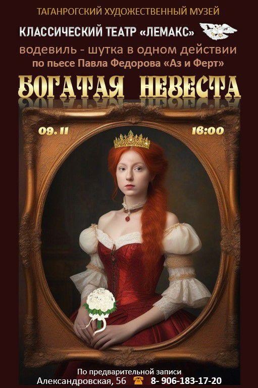 В предстоящую субботу, 9 ноября, в Таганрогском художественном музее выступят артисты классического театра «Лемакс» со спектаклем «Богатая невеста». Водевиль-шутка поставлен по пьесе российского драматурга Павла Федорова (1803-1879) «Аз и Ферт, или Свадьба с вензелями». Тема любви и тема выгоды, конфликт между естественным и искусственным чувством — вечные вопросы, поэтому пьеса актуальна и сегодня. Яркая фарсовая форма спектакля и узнаваемые ситуации превращают водевиль в искрометный и веселый праздник. Спектакль начнется в 16.00 в здании музея на улице Александровской, 56. Посещение по предварительной записи. Справки по телефону: 8-906-183-17-20. Ранее мы рассказали, что в Таганроге открылась первая на Дону детская филармония. Фото ВК Новый классический театр «Лемакс»