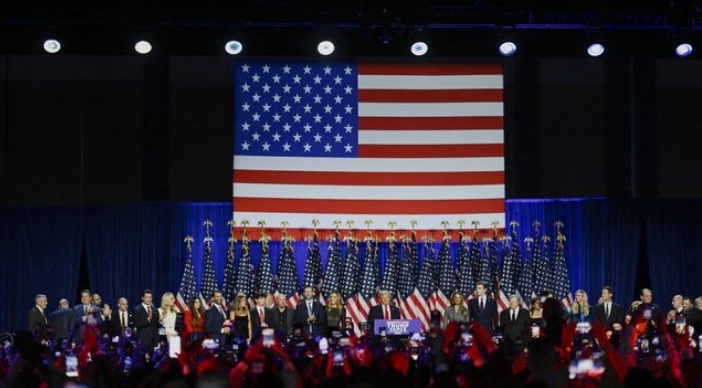 Кандидат в президенты от Республиканской партии и бывший президент США Дональд Трамп выходит на сцену после оглашения предварительных результатов президентских выборов в США 2024 года в конференц-центре округа Палм-Бич в Уэст-Палм-Бич, Флорида, США, 6 ноября 2024 года. REUTERS/Callaghan O'Hare