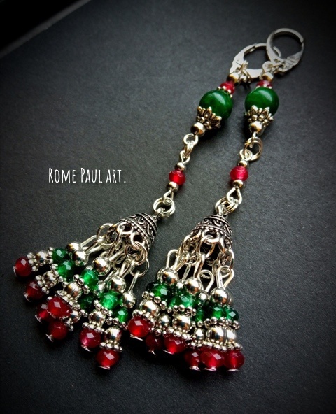 Волшебные, завораживающие авторские серьги-люстры из гранатового и изумрудного агатов и посеребрённой 925 пр. фурнитуры ручной работы. Яркие, княжеские... Материалы: натуральный изумрудный агат (4 мм, ювелирная огранка, Бразилия), натуральный рубиновый агат (4 мм, ювелирная огранка, Бразилия), натуральный зелёный агат (8 мм, Бразилия), посеребрённая 925 пр. фурнитура (ювелирный сплав) Длина серьги: 100 мм Швенза - французский замок. Этот кpacный рубиновый aгaт accoцииpyeтcя c coлнцeм, жизнeннoй cилoй, здopoвьeм. Он также стал священным камнем в еврейских культурах, где Моисей использовал его как символ Духа Божьего. Сегодня рубиновый агат является фаворитом среди верующих в кристаллы, так как считается, что он обладает мистическими силами и энергией, которые могут обеспечить защиту и улучшить различные аспекты вашей жизни. ...изумрудный агат по своему оттенку очень напоминает изумруд, но имеет свои характеристики и особые магические и лечебные свойства. Грани камня переливаются и светя