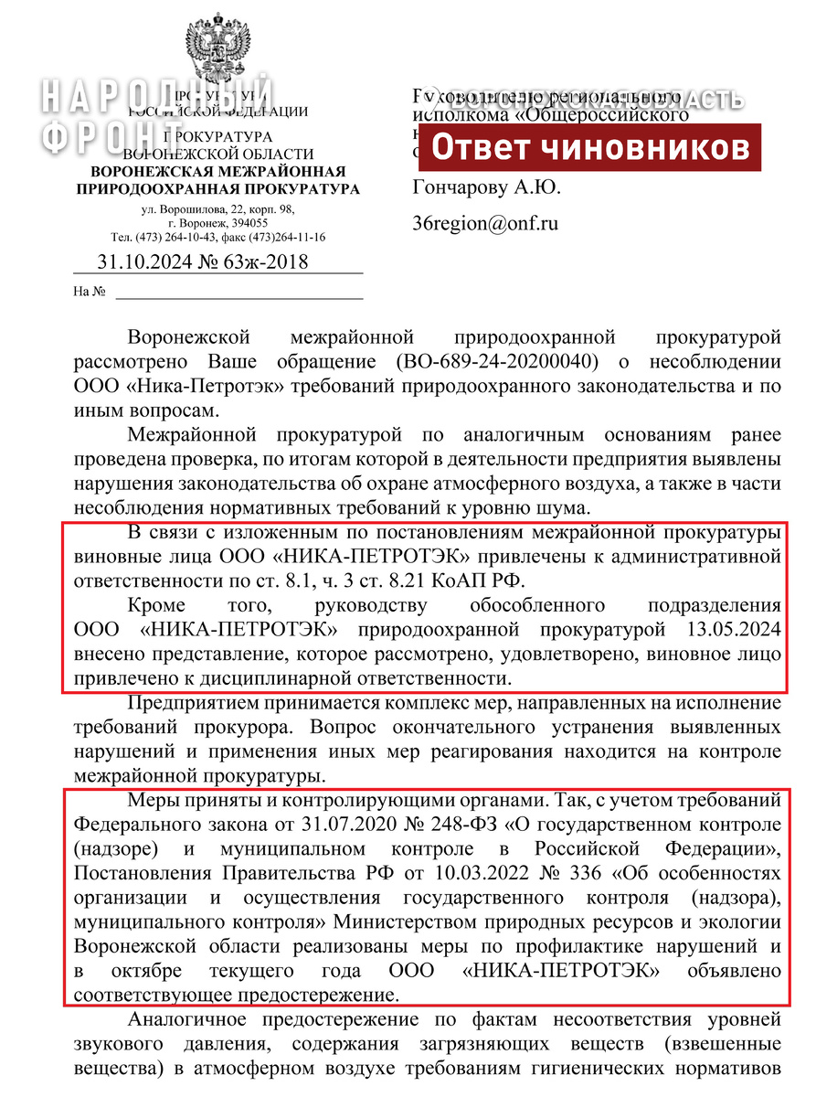 Об этом в ответ на обращение Народного фронта сообщили в Воронежской межрайонной природоохранной прокуратуре. Истцом выступило региональное управление Роспотребнадзора. Оно требует привести уровень шума и выбросов к нормативным показателям. Кроме того, природоохранная прокуратура наказала административно конкретных виновников, а руководству завода внесено представление об устранении нарушений законодательства. Решение проблемы пыльных выбросов и шума с промплощадки компании «Ника Петротэк» на контроле Народного фронта с апреля текущего года. После наших сигналов подключился Следственный комитет и лично глава ведомства Александр Бастрыкин, администрация Семилукского района. Мы продолжаем настаивать на скорейшем обновлении фильтрующих установок и грохочущего старого оборудования. Народный фронт остается на связи с жителями прилегающих к предприятию улиц.