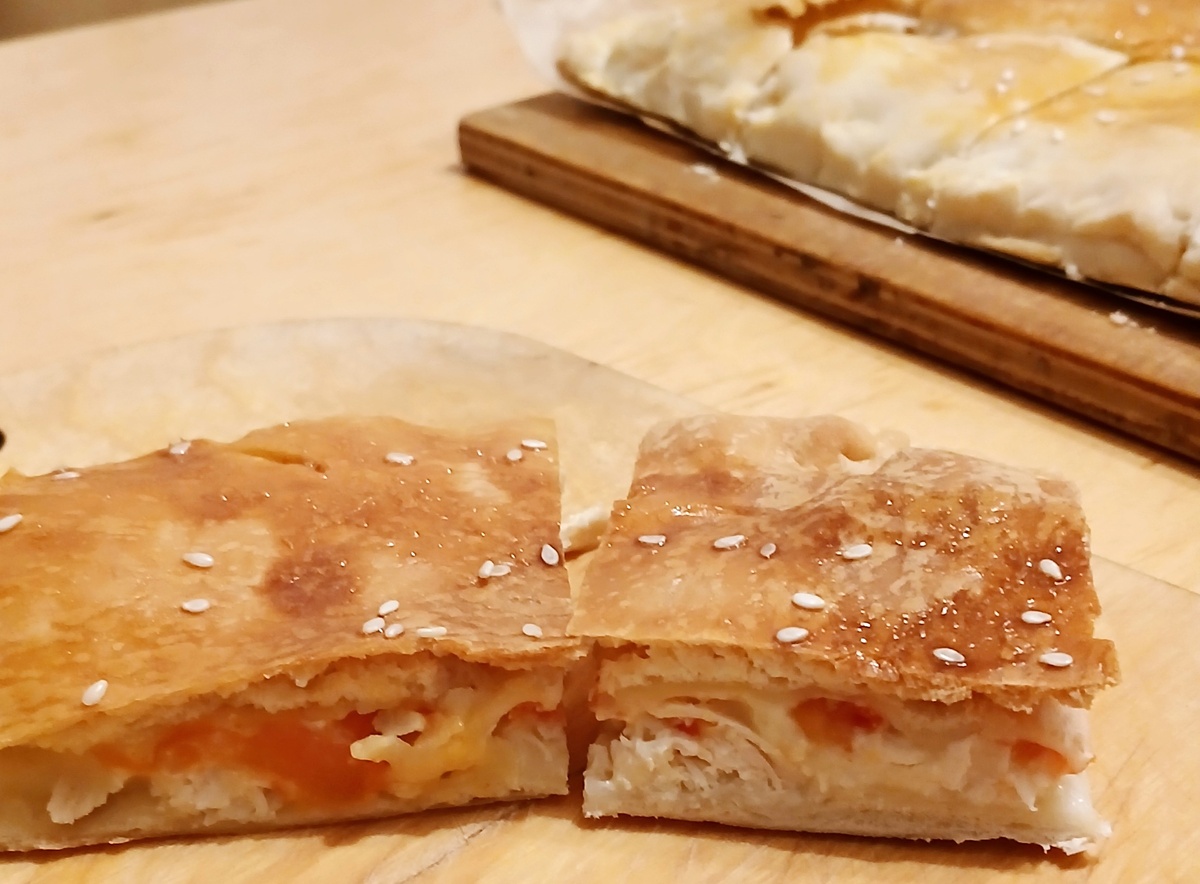 Пирог получается очень мягким и нежным на вкус. Готовится он просто и быстро, что немаловажно, ведь он такой вкусный, что может стать вашей любимой выпечкой. Куриное филе заранее отварить, и остудить. Помидоры нарезать тонкими кружочками. Сыр натереть на терке. Затем порезать филе на кусочки. Слоеное тесто раскатать, на одну половину выложить немного сыра, сверху филе, затем помидоры, и посыпать оставшимся сыром. Накрыть второй половиной теста и защипнуть края. Пирог выложить в форму или противень, застеленный пергаментом. Сделать небольшие надрезы, смазать пирог желтком и посыпать кунжутом. Выпекать при 200 градусах около 30 минут.