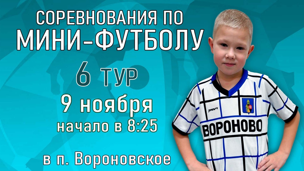 09.11.2024 года (Суббота) пройдет 6 тур соревнований по мини-футболу МБУ "СК "Вороново" среди детей 2011-2012, 2013-2014, 2015-2016 г.р.