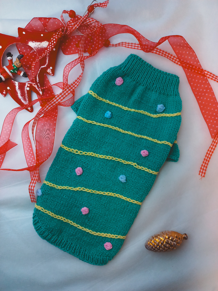 Зима приносит не только холод, но и тепло праздника, когда весь мир наполняется радостью и ожиданием новогодних чудес. В этот волшебный период многие хозяева решают порадовать своих пушистых друзей, облачив их в стильные новогодние свитера. Представьте себе: ваш любимец, уютно устроившийся у камина, в ярком свитере с изображением снежинок или оленей, излучает праздничное настроение. Вязала этот свитер на двух спицах №2 из детской пряжи Alize Cotton gold №610. Параметры моего питомца - обхват шеи 20см длина по спинке 30см длина по животику 23см обхват пухлой части животика 30см 1. Исходя из моих данных я набрала 80 петель для ошейника и вязала узором двухсторонняя лицевая гладь (или двойная резинка) 2,5см (12 рядов) 2. Далее перешла на обычный лицевой и изнаночный узор и вязала еще 12 рядов. 3. Рукава. В начале 13 ряда провязать 10 лицевых петель (это половинка от грудки будет). Поставить маркер и сделать прибавку из протяжки с наклоном в право. Провязать 5 петель лицевыми и снова сдел