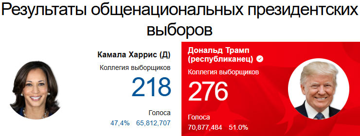 CBS News прогнозирует, что бывший президент Дональд Трамп победит на президентских выборах, победив вице-президента Камалу Харрис и став 47-м президентом Соединенных Штатов. Прогноз CBS News для Трампа в Висконсине вывел его на финишную прямую рано утром в среду, после более ранних прогнозов о победе Трампа в колеблющихся штатах Северной Каролине, Джорджии и Пенсильвании . По оценкам CBS News, Трамп преодолеет порог голосов выборщиков в 270 на 6 голосов, что в общей сложности составит 276 голосов. В нескольких других штатах еще продолжался подсчет голосов. Трамп объявил о победе в своей речи перед сторонниками рано утром в среду, вместе со своей семьей и напарником сенатором Дж. Д. Вэнсом. «Я хочу поблагодарить американский народ за исключительную честь быть избранным вашим 47-м президентом и вашим 45-м президентом, — сказал Трамп в своем предвыборном штабе во Флориде. — И каждый гражданин, я буду бороться за вас, за вашу семью и за ваше будущее. Каждый день я буду бороться за вас каж