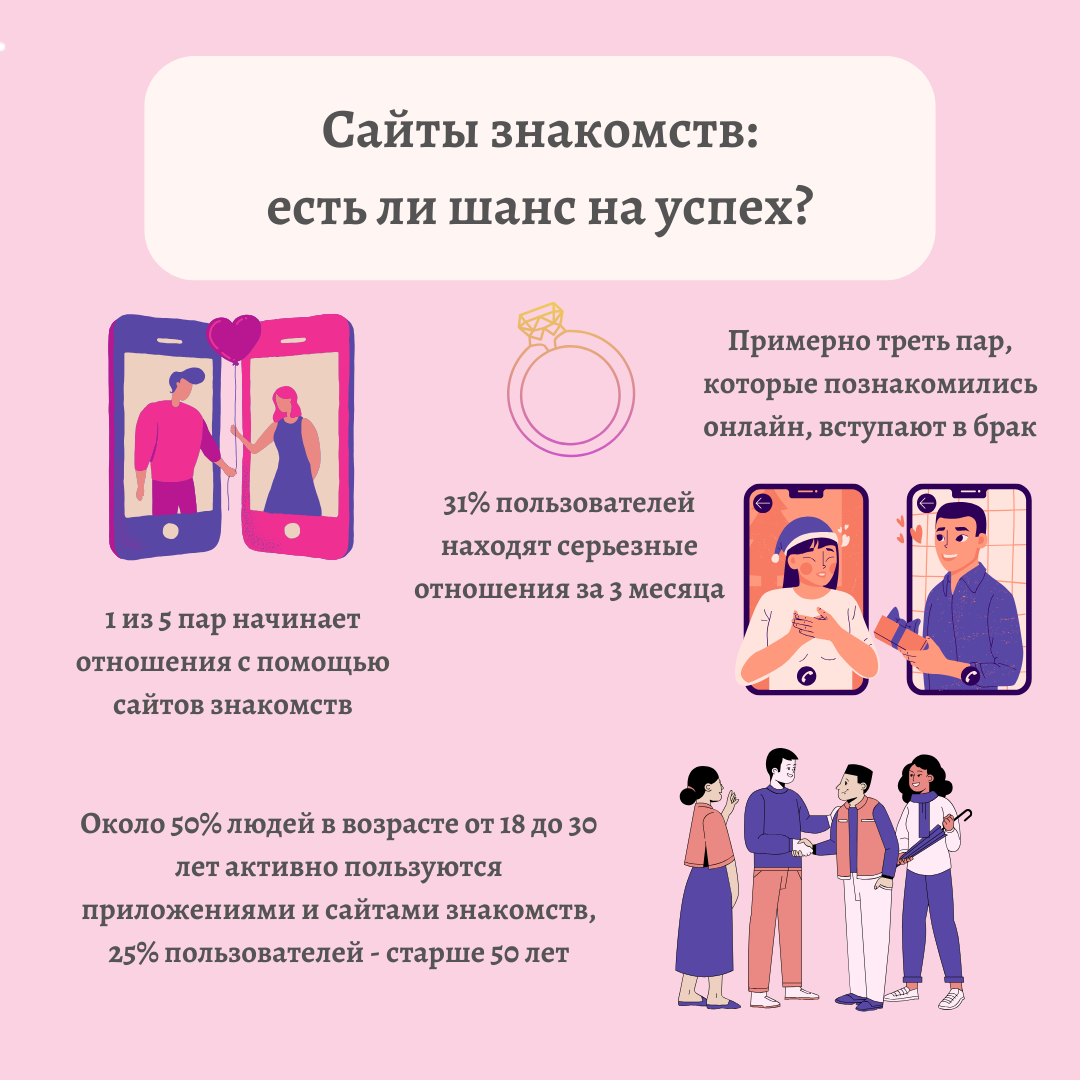 Сайты знакомств: есть ли шанс на успех? 👀 Какие шансы найти любовь на сайте знакомств? 💖 Делимся статистикой, которая вас точно убедит! 🔹Примерно треть пар, которые познакомились онлайн, вступают в брак. 🔹Алгоритмы увеличивают вероятность найти подходящего партнера на 20-30%, так как учитывают предпочтения и психологические профили. 🔹С 2020 года количество людей, использующих приложения, выросло среди всех возрастных групп, включая тех, кому за 50. 🔹Примерно 55% пользователей регистрируются на сайтах знакомств с целью найти серьезные отношения, что увеличивает шанс на успешное знакомство. 🔹31% пользователей находят серьезные отношения за 3 месяца, в среднем нужно 5 месяцев на поиск подходящего человека. 🔹По данным различных опросов, 60% людей, которые используют онлайн-знакомства, заявляют, что их опыт общения был положительным и превзошел ожидания. 🔹Около 75% людей используют более одного сайта или приложения для знакомств, пробуя различные платформы для поиска лучшего совпад