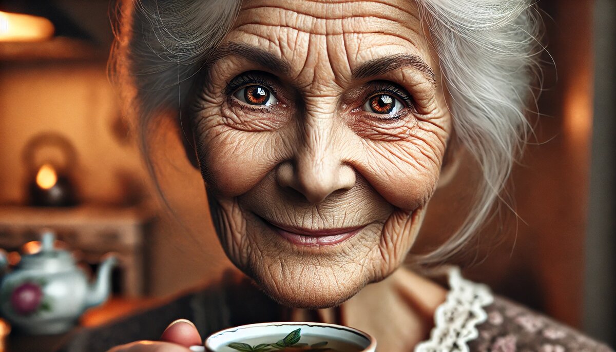 На её морщинистом лице играла загадочная улыбка, а в глазах плясали озорные искорки.