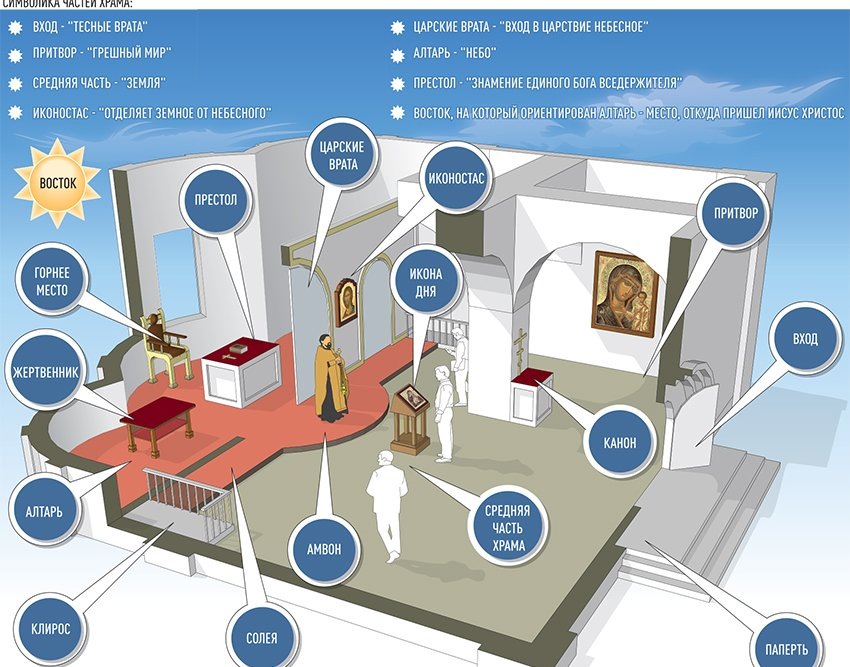 Православный храм по внутреннему устройству делится на три части: алтарь, средний храм и притвор. Алтарь символизирует Царство Небесное. Здесь совершаются богослужения и находится главная святыня — престол, на котором таинственно присутствует Сам Господь и совершается таинство Причащения Тела и Крови Господней.