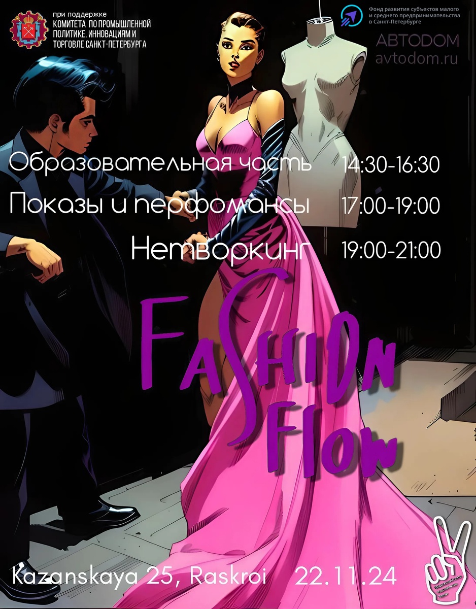 ⚡️SAVE THE DATE⚡️ 22 ноября в пространстве «Raskroi» состоится Fashion flow - значимое событие в мире моды Петербурга. Fashion flow - это поток, создающий индустрию моды в культурной столице России - комьюнити людей, живущих модой, они и есть мода. Дизайнеры, модели, фотографы, стилисты, инфлюенцеры и блогеры, покупатели и байеры, инвесторы и прочие стейкхолдеры в свободном потоке творят новую историю фешн индустрии. В программе: ✌️Образовательная часть. Круглый стол с экспертами отрасли на актуальную тему «Коммерциализация творчества дизайнера. Как создать успешный продукт». ✌️Экспозиция интересных дизайнерских вещей. Каждый дизайнер может заполнить регистрационную форму и принять участие в однодневном шоу-руме, представив результаты своего творчества потенциальным покупателям, байерам, блогерам. ✌️Показы и перфомансы неотъемлемая часть Fashion flow. Показы сопровождаются интервью с дизайнерами, мастер-классами от профессионалов в сфере моды. ✌️Нетворкинг. Каждый участн