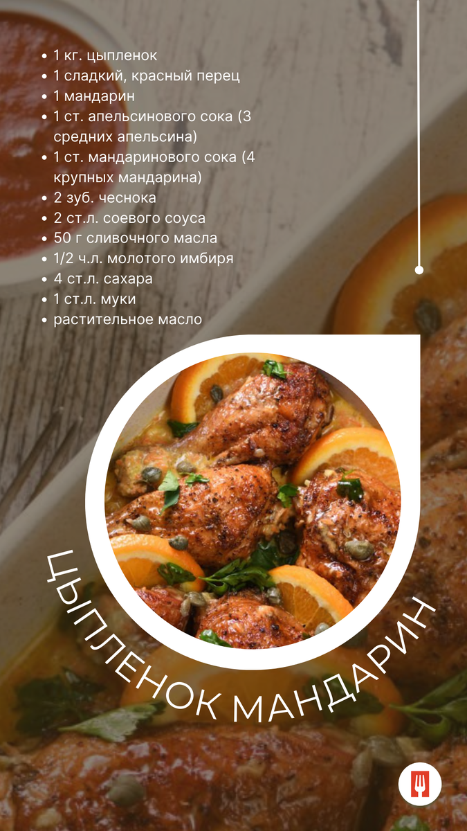 Цыпленок мандарин🍊 1️⃣Цыпленка разрезаем на 8 кусочков и обжариваем на разогретой сковороде с растительным маслом до золотистой корочки. Перекладываем в жаростойкую форму. 2️⃣На той же сковороде слегка обжариваем мелко нарезанный сладкий перец и добавляем к цыпленку. 3️⃣Растапливаем сливочное масло, добавляем муку и размешиваем до однородной массы. В отдельной посуде смешиваем сок, сахар, имбирь, соевый соус и чеснок. Постепенно вливаем эту смесь в сковороду с мукой, постоянно помешивая, пока соус не загустеет. Вливаем соус в форму к цыпленку. 4️⃣Добавляем очищенные дольки мандарина и накрываем форму крышкой или фольгой. Ставим в разогретую до 180°C духовку на 30 минут. 5️⃣Получается вкусный и сочный цыпленок в кисло-сладком соусе с цитрусовой ноткой. Приятного аппетита❤️ #готовим_с_Koolinar #рецепт_дня