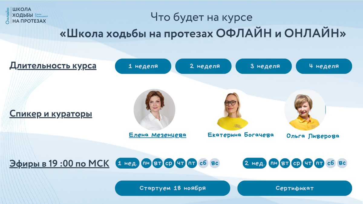 Коллеги и друзья, приветствуем вас! 👋 Наш обучающий курс для специалистов и желающих ими стать «Школа Ходьбы на протезах» собрал весьма себе внушительное количество заявок, но еще больше мы услышали пожеланий организации нами такого курса, который бы: - не потребовал затрат на дорогу и проживание, - финансово был бы не так обременителен, - не сильно ломал обычный личный график жизни и работы, - не занимал много времени каждый день, - велись бы записи занятий и их можно было бы посмотреть потом самому отдельно в удобное время, и не один раз, - было бы много практических знаний для самостоятельной работы - комплексов упражнений, лайфхаков и даже готовых видеоуроков, - специалисты получили бы дополнительные уникальные знания и умения, которые не преподают больше нигде, - чтобы все равно получить такой же документ, как и при личном присутствии. И мы его сделали! Итак, встречайте, наш обновленный обучающий курс для специалистов и желающих ими стать - 👉«Школа Ходьбы на протезах ОФЛАЙН и ОН