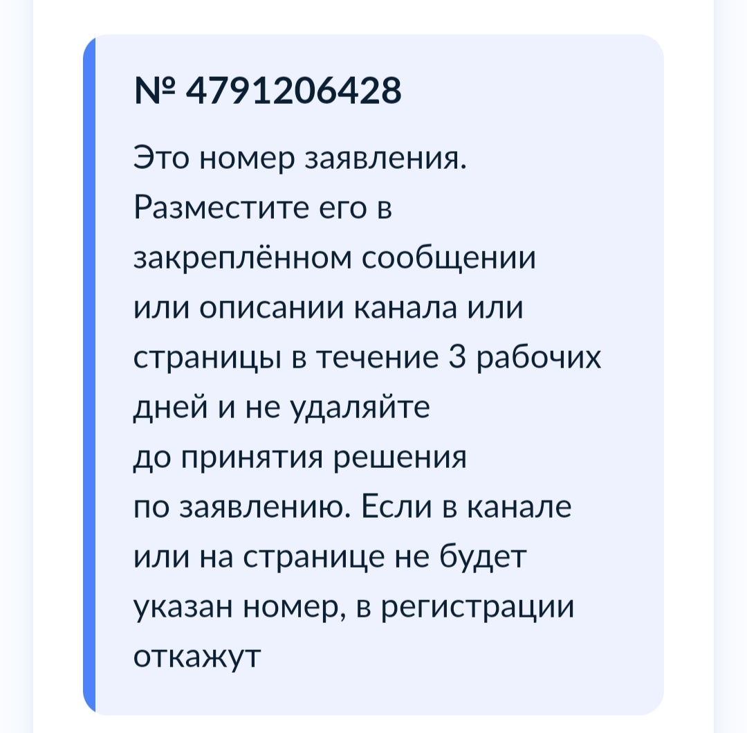 Как законопослушный блогер, зарегистрировалась в Роскомнадзоре. Номер заявления 4791206428 Не хвастаюсь, а выполняю законные требования. Может, теневой бан заодно снимут?😄