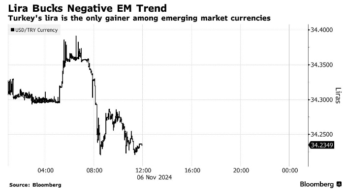 Иностранные фонды покупают после того, как государственные банки вмешались, чтобы остановить потери В среду турецкая лира стала единственной валютой развивающейся страны, которая укрепилась по отношению к доллару. Это произошло после того, как участники рынка по всему миру обсудили перспективы возвращения Дональда Трампа в Белый дом. По данным трейдеров, которые предпочли остаться анонимными, поскольку не имеют права публично выступать, валюта укрепилась на 0,3% по отношению к доллару по состоянию на 9:55 утра в Лондоне. Это стало возможным благодаря активной поддержке со стороны государственных банков, которые также способствовали выходу иностранных фондов на рынок. Государственные кредиторы продали более 500 миллионов долларов, чтобы поддержать лиру на уровне около 34,3550 за доллар. Это произошло в основном в часы азиатских торгов, когда другие валюты развивающихся рынков падали на фоне перспективы победы Трампа. Трейдеры сообщают, что к ним присоединились хедж-фонды, которые воспол