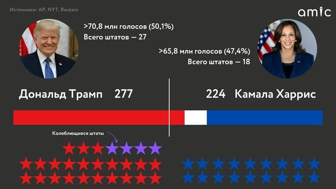 Дональд Трамп уже выступил перед сторонниками и объявил о победе Дональд Трамп одержал убедительную победу на президентских выборах в США. Он с большим отрывом опередил свою соперницу от Демократической партии Камалу Харрис. О том, как распределились голоса избирателей, – в нашей инфографике. Ранее Трамп уже выступил перед сторонниками. Он подтвердил свою победу, назвав себя "47-м президентом США". По его мнению, аналогов этому триумфу в американской истории нет. Свои поздравления народному избраннику уже направили президент Франции Эммануэль Макрон и президент Польши Анджей Дуда. Больше материалов на amic.ru.