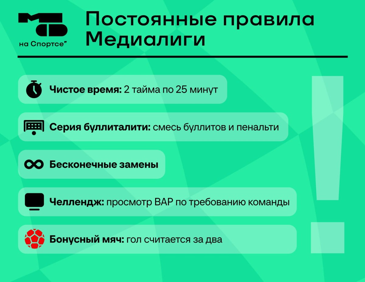 Ниже – рассказ о 14 уникальных правилах с комментариями автора и технического директора Медиалиги Дмитрия Кортавы. Он рассказал, как правила работают в медиафутболе и есть ли шанс увидеть их в профи.