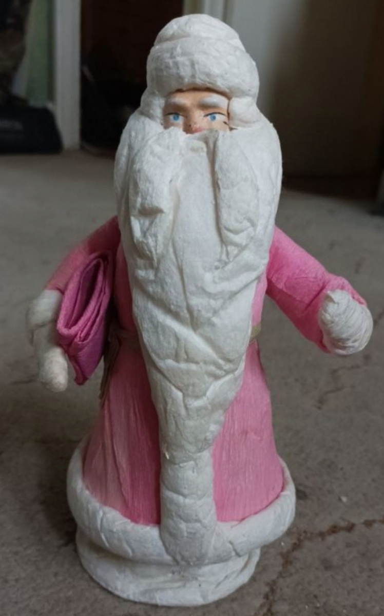 Начало статьи тут Сегодня мы с вами познакомимся с интересными моделями Дедов Морозов, изготовленных из гипса на Пушкинской фабрике ёлочных украшений в посёлке Клязьма. Это так называемая ватно-гипсовая серия. В 1965 году на фабрике произошли значительные изменения: была проведена большая реорганизация и обновлен ассортимент товаров. Одной из первых в производстве появилась фигурка маленького Дедушки Мороза размером 25 сантиметров. Его основа была отлита из гипса, два слепка, соединённые вместе, внутри он пустотелый, а шубка изготовлена из креп-бумаги. Окончательный облик дополнялся ватной опушкой по подолу и небольшим воротником. Шуба имела разнообразные цвета. Родной поясок был также из крепированной бумаги. Специально для этой модели был разработан новый молд лица, который немного похож образ Калининского дедушки. Лицо деда из пресс-опилок. Причем в ранних работах лицо расписывали с морщинами, а после 1967 год, без них. В одной руке у него посох с ватным навешием, а в друго