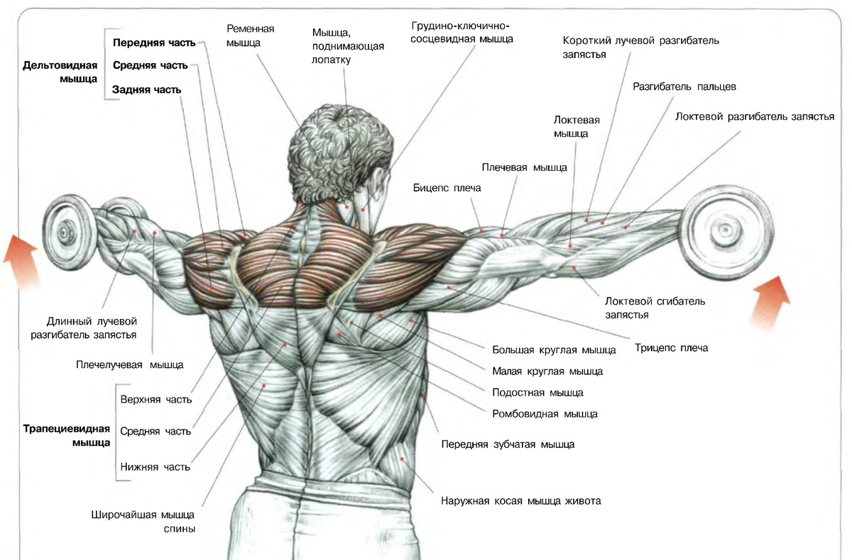 Это упражнение для тренировки дельтовидных мышц (главным образом средней головки). В упражнении также участвуют трапециевидные мышцы.